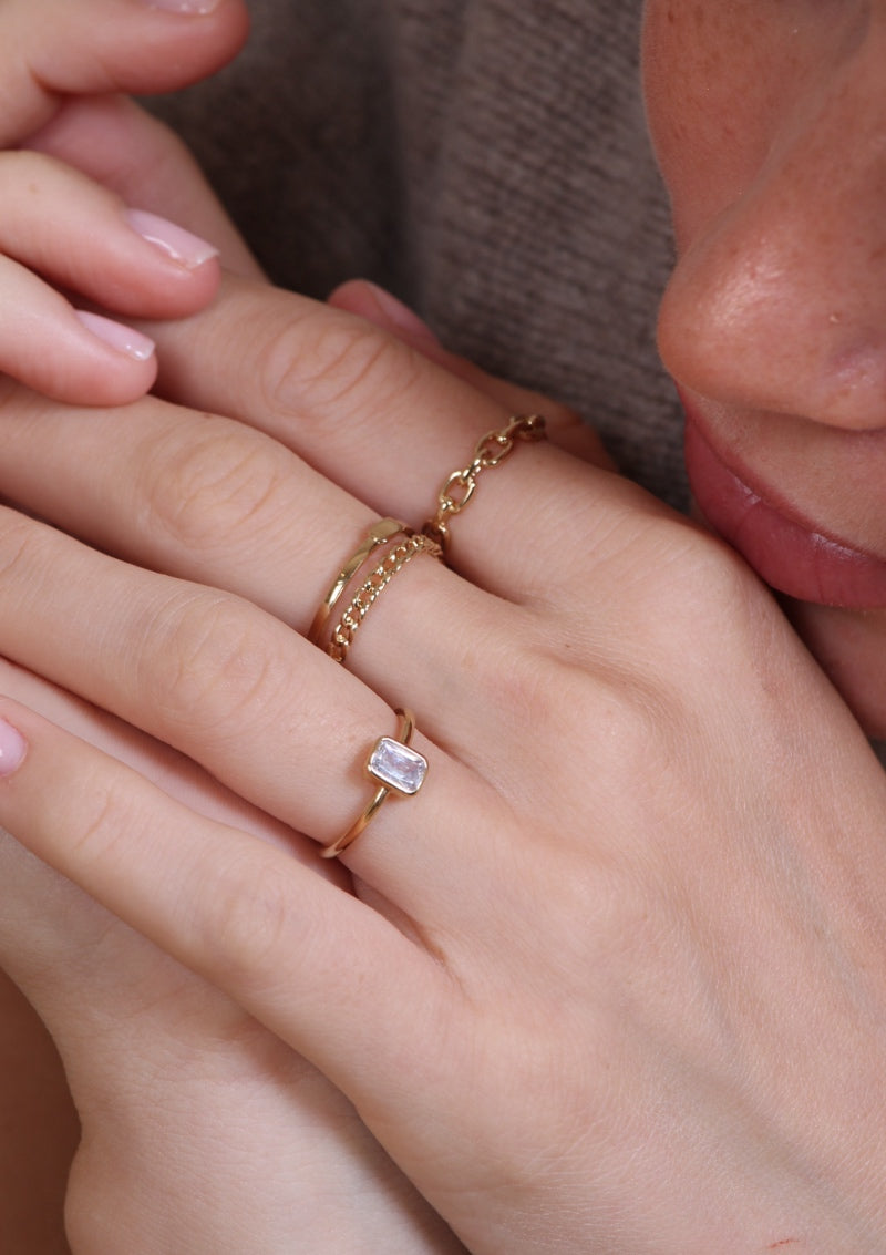 Vous aimiez les bagues fines à accumuler ? Nous vous présentons Léonie ! Parfait compromis avec ces deux bagues fines reliées en une seule ! Toujours en plaqué or 3 microns.