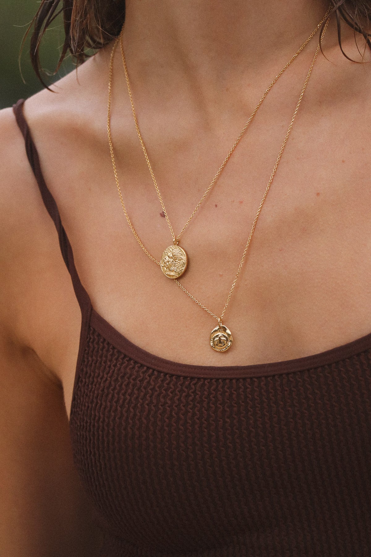 3-micron gold-plated necklace featuring a round Aztec-inspired bird pendant. You can personalize it by choosing the type and length of chain.