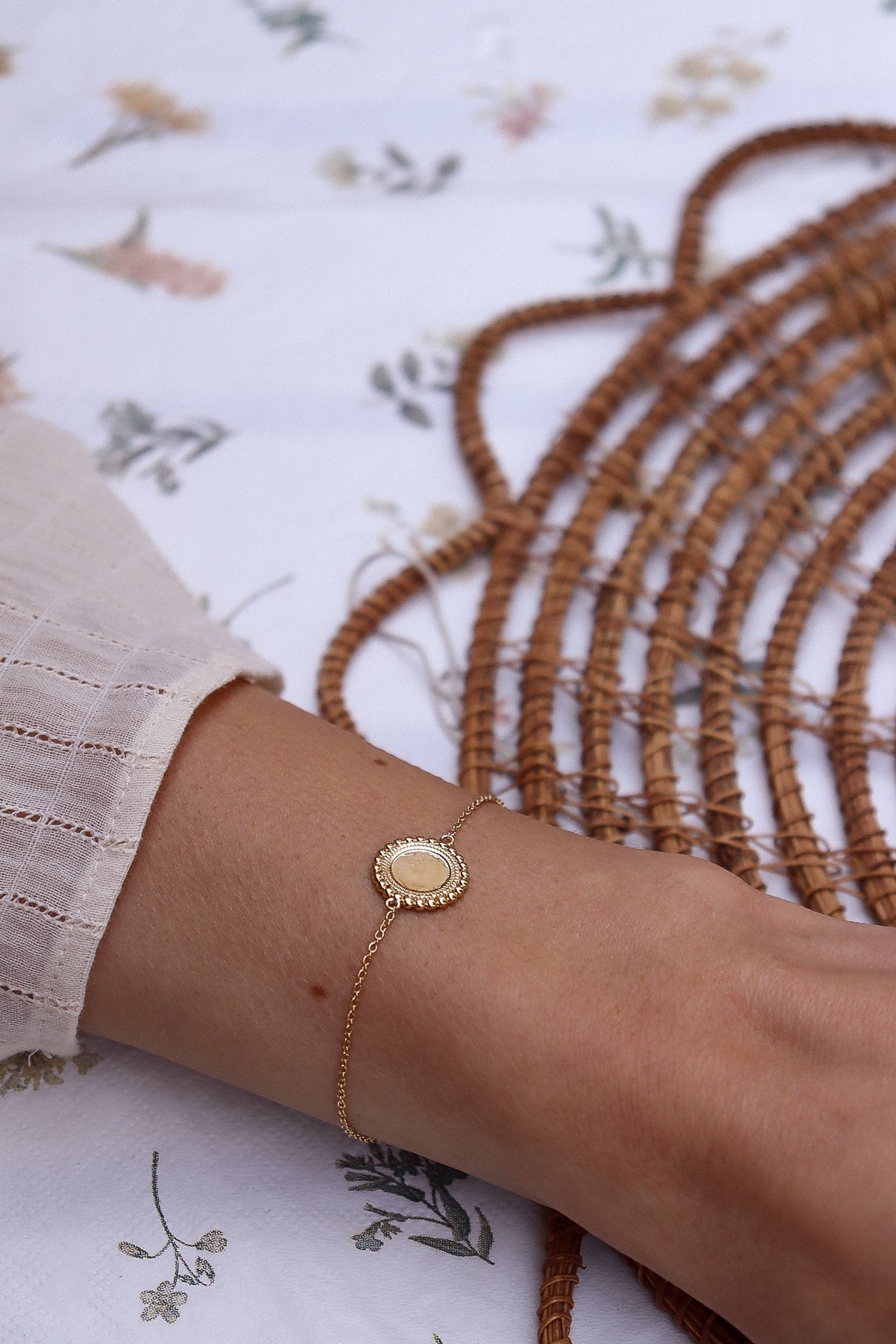 Découvrez ce bracelet avec chaîne forçat fine accompagnée de sa pièce délicate entourée d'un détail perlé. Il est intemporel et pourra vous accompagner lors de toutes vos sorties !